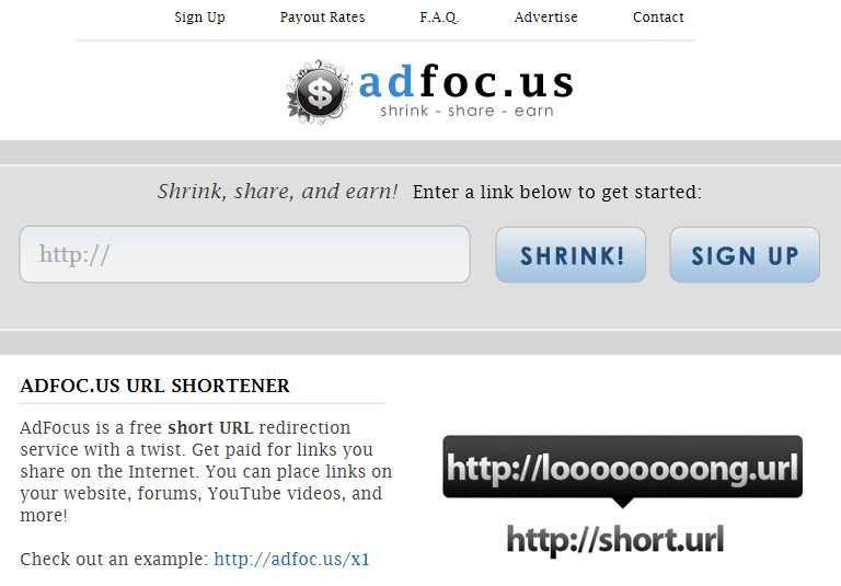 AdFocus is one of the best URL shortening tools in the world which pays users for shortening, and it has been around for more than 3 years now and has been actively paying its users to this date. You can find these links actively being shared on forums, blogs, and emails and these are one of the best ways to earn money from the shorteners.